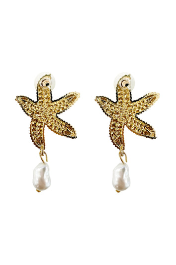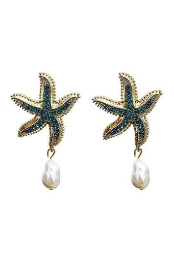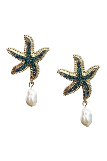 The Deliah Pearl Starfish Earrings will be a stylish addition to your look. This starfish is crafted with gold hardware and centred with a multicoloured blue diamante accents and a pearl drop. You can pair this with any look to add a youthful touch.
