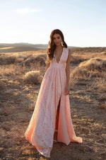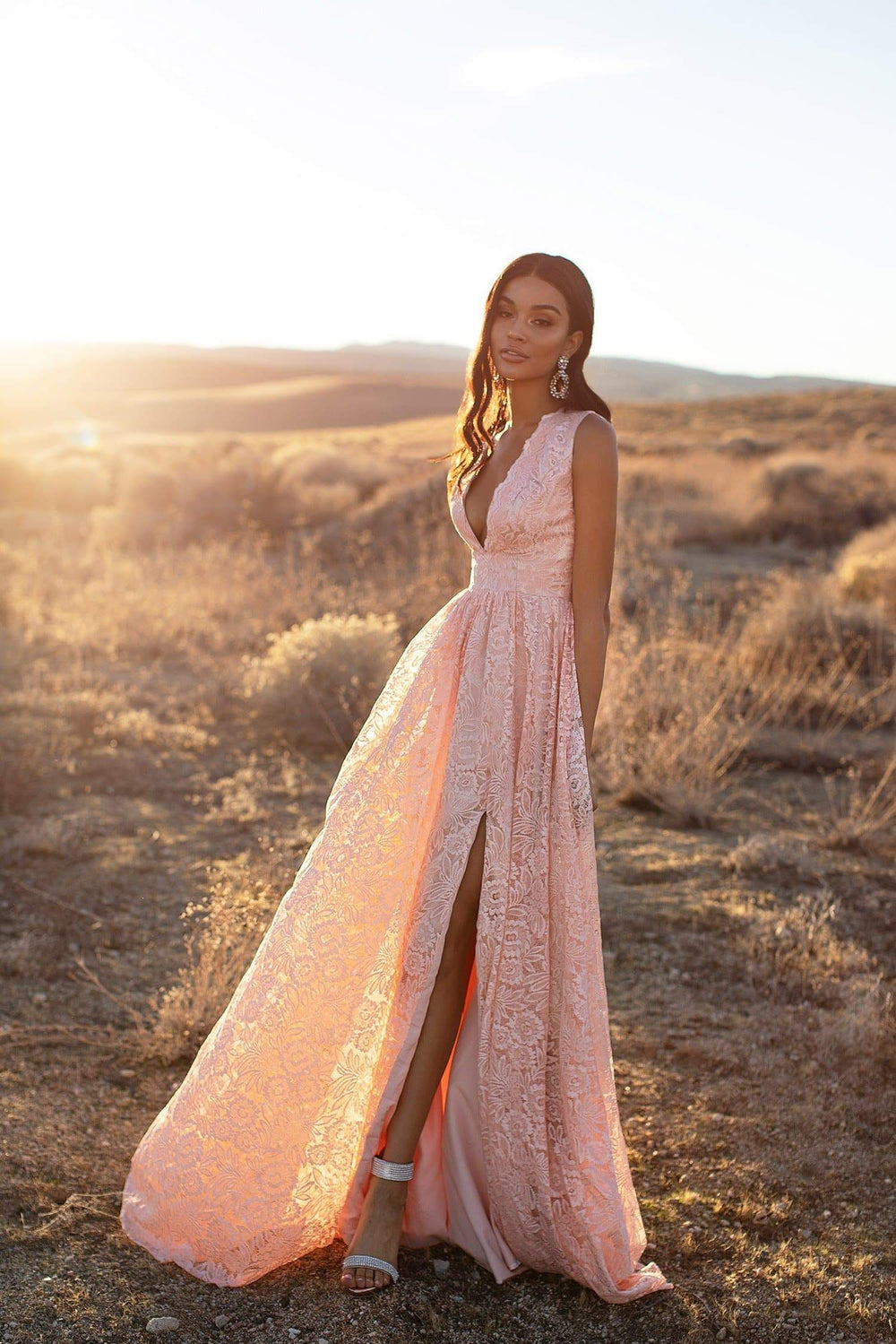 The new Genelle Lace Gown in peach is so dreamy. This gown features a plunge neckline, side slit & is made from gorgeous delicate lace fabric with scalloped edges. Genelle is fully lined & has minimal stretch.