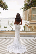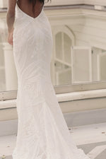 Glamorous & show-stopping, the Alayna Gown is made from our signature sequin patterned fabric in a classic white tone. This gown features a cowl neckline, fitted mermaid silhouette with a train & adjustable criss-cross back straps.