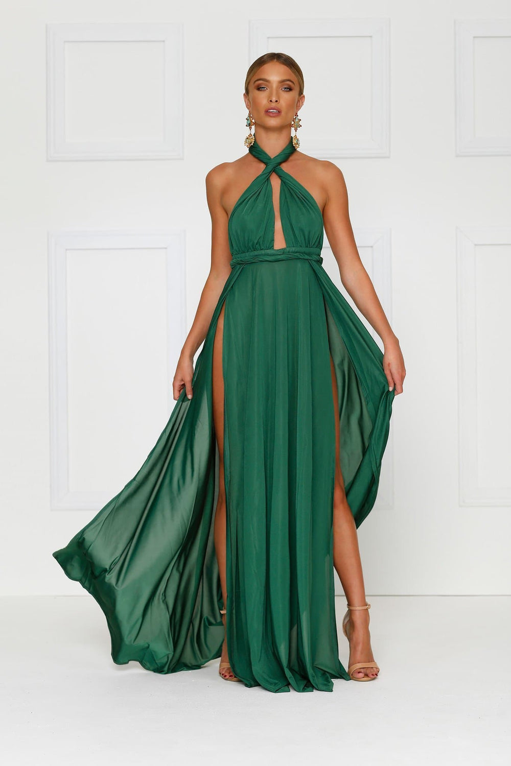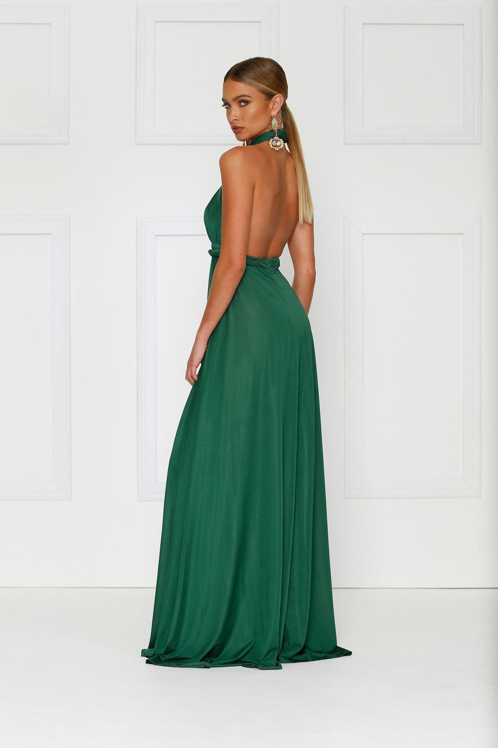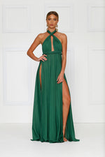 Let your inner goddess speak when you make an entrance in this exquisite 2 way maxi dress. Made from premium jersey slinky fabric that has a slight shine to it and is super stretchy and soft.  Featuring a plunge neckline and high cut out slits at the front of the dress which can be easily altered if required.