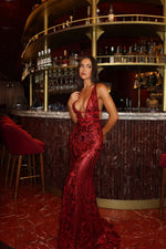 Experience regal opulence in Elyse. This gown exudes an irresistible blend of glamour, adorned with an intricate sequin pattern and elegant strappy detailing at the waist and back. The allure of a shimmering burgundy gown is both luxurious and captivating. Elyse embraces this elegance in full, with a sheer design complimented by a detachable booty shorts.