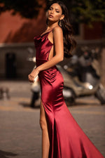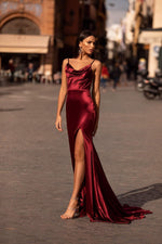 This gown is the definition of show-stopping. Turn heads when you arrive in this sexy & stylish silky satin gown. Estela features a cowl neckline, low back with incredible ruching details & a side slit with a train. A must-have gown if you want to look your best.