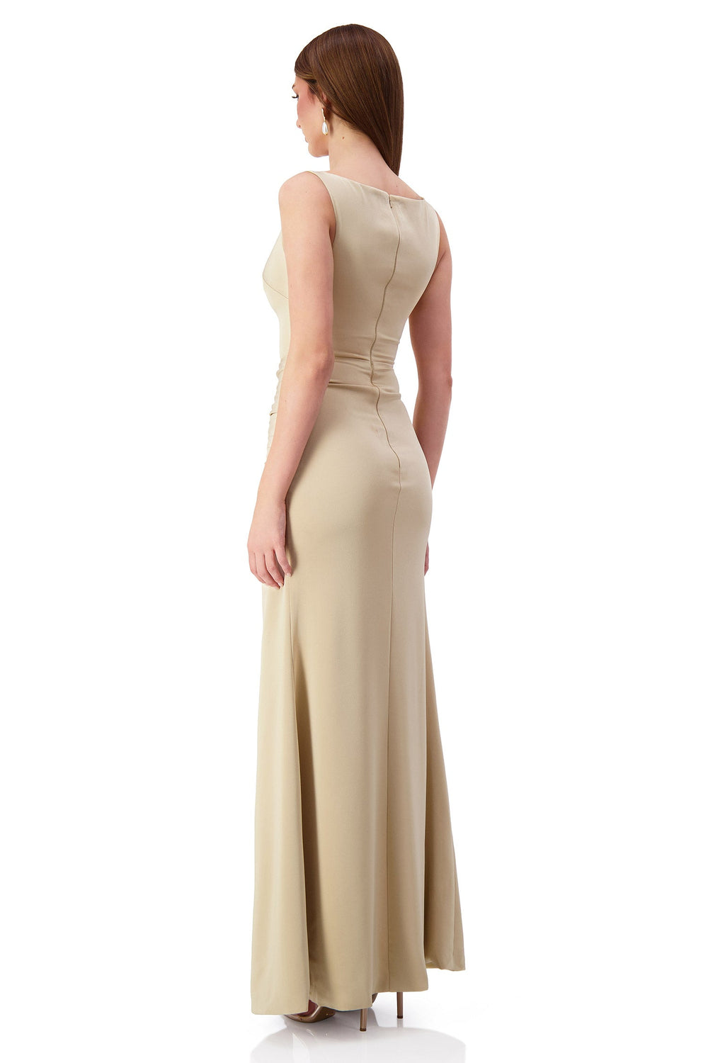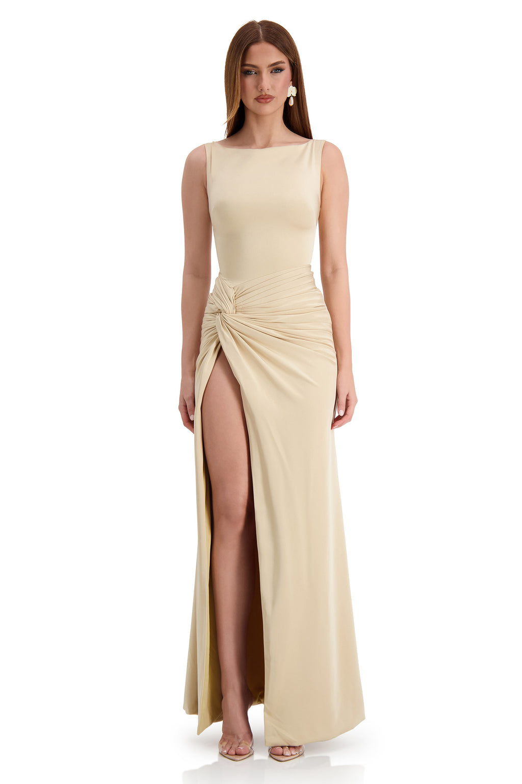 Kehlani Boat Neck Knot Slit Beige Gown