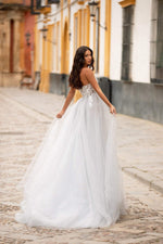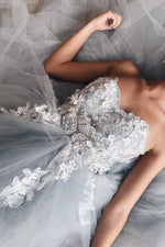 Feel like you walked straight out of a fairy tale when you arrive at your special event. The Laurensa tulle gown is made from faded blue / grey tulle & features the dreamiest detailed bodice with 3D florals, pearls & beading.