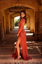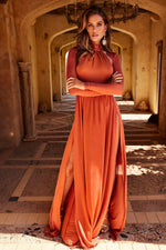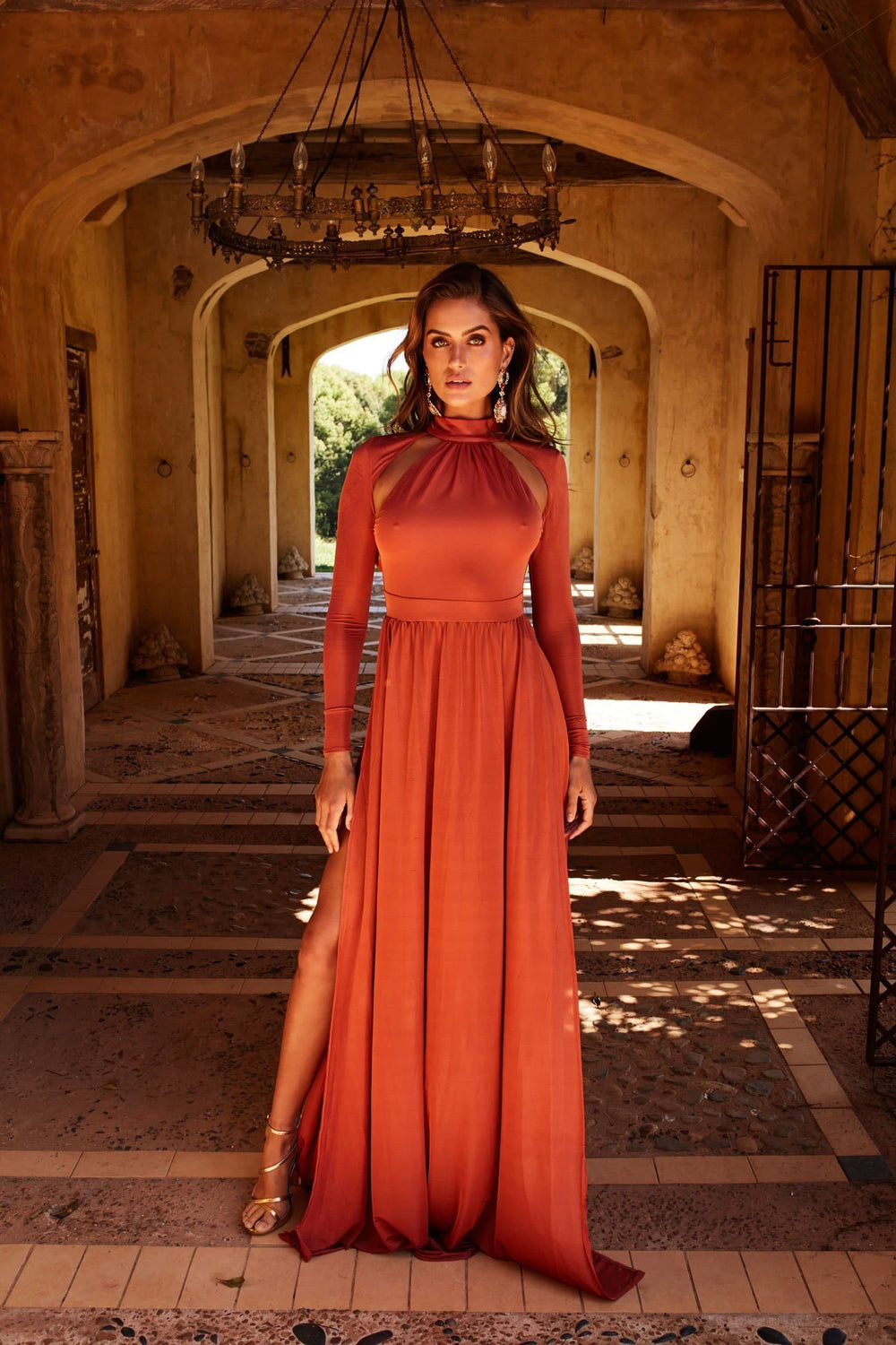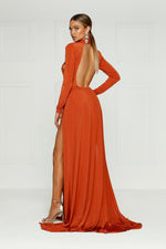 Sophisticated and flirty, the Liliya gown promises to make an entrance. This glamorous dress features a halter neckline, sexy cut outs, long sleeves, two thigh-high slits and a daring low back. Made from luxurious jersey stretchy fabric, this dress is extra long, only lined at the bust and has an invisible zipper on the back.
