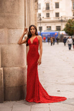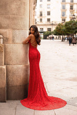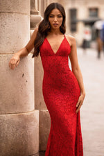 Look like a total bombshell in the Perla Shimmering Lace Gown. This stunning red gown features a deep v-neckline, thin straps with a lace-up back and mermaid train. This gown is stretchy & curve hugging, and fully lined. You'll turn heads in Perla.