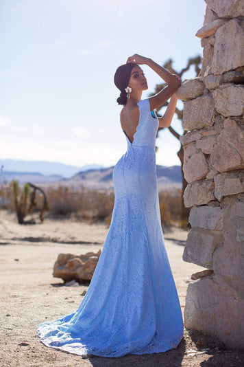 Ivy is the most stunning new sky blue lace gown. So pretty & feminine, this gown will be a gown you'll never regret. Featuring a plunge neckline, low back, mermaid train and scalloped lace edges. Ivy is so delicate & dreamy, you'll never want to take it off. Fully lined with minimal stretch.