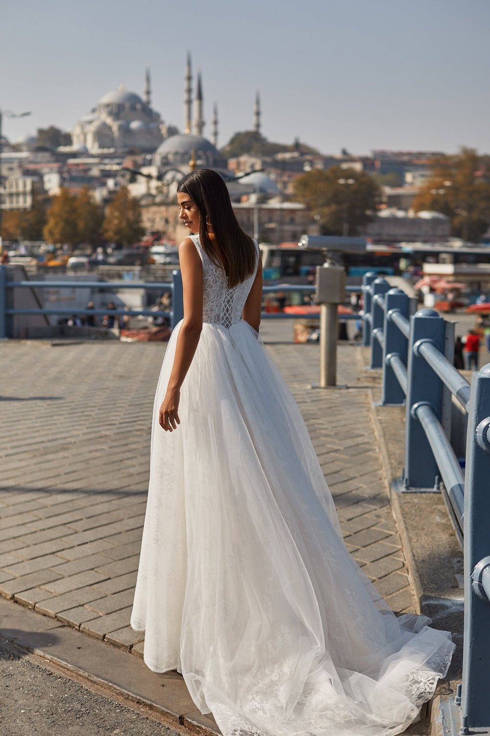 Indulge in the romantic and feminine allure of the Ece Gown. Crafted from intricate lace fabric, this gown boasts a sheer tulle skirt overlay adorned with pearl accents and features subtle nude mesh inserts on the bust and sides. Its classic lace-up back adds an elegant finishing touch. The Ece Gown is a testament to timeless sophistication.