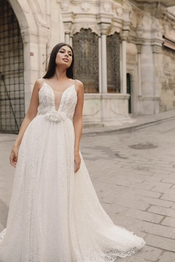 In search of a sophisticated ball gown to adorn your special day? The Emira Gown, with its blend of romance and modernity, radiates confidence through its shimmering fabric, intricate floral center detail, and lace-up back. With a low V-neckline and a sheer nude mesh insert, this gown beckons to the discerning modern bride, offering timeless elegance with a mature and refined charm.