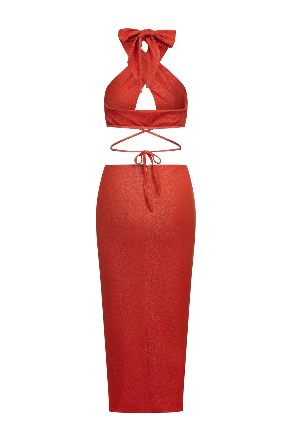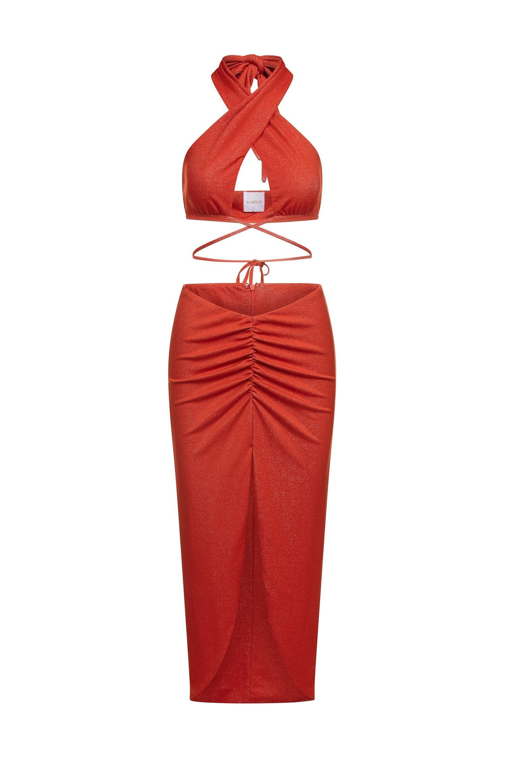 Steal the spotlight in the Maddalena Set. This burnt orange two-piece shimmers in the light with its lurex jersey fabric. Featuring a criss-cross bustier with waist ties & a matching midi skirt with ruching details and a slit. The Maddalena was made to flatter your figure.