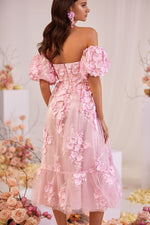 Feminity takes control in the Patrizia Dress. Created in a baby pink hue and elevated with a structured bodice, puff off-shoulder sleeves, and an a-line silhouette. This luxurious midi dress is rendered from our favourite 3D floral fabric to allow all the attention to fall on you.