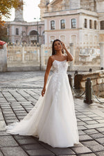 Full of feminine flair, the Rabia Gown fits a classic approach to your wedding look. Rendered from a patterned tulle fabric with a low back with a lace-up addition, delicate thin sleeves, and a criss-cross tulle paneled bustier. Eye-catching and timeless, the Rabia Gown will not be forgotten.