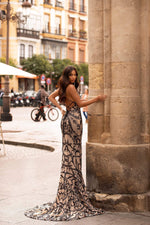 Striking & unique, the Ramona Sequin Gown is made from our exclusive patterned shimmering fabric in black, on top of chic nude lining. Ramona also has a stunning scoop neckline and lace-up back with a luxe train.