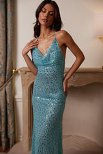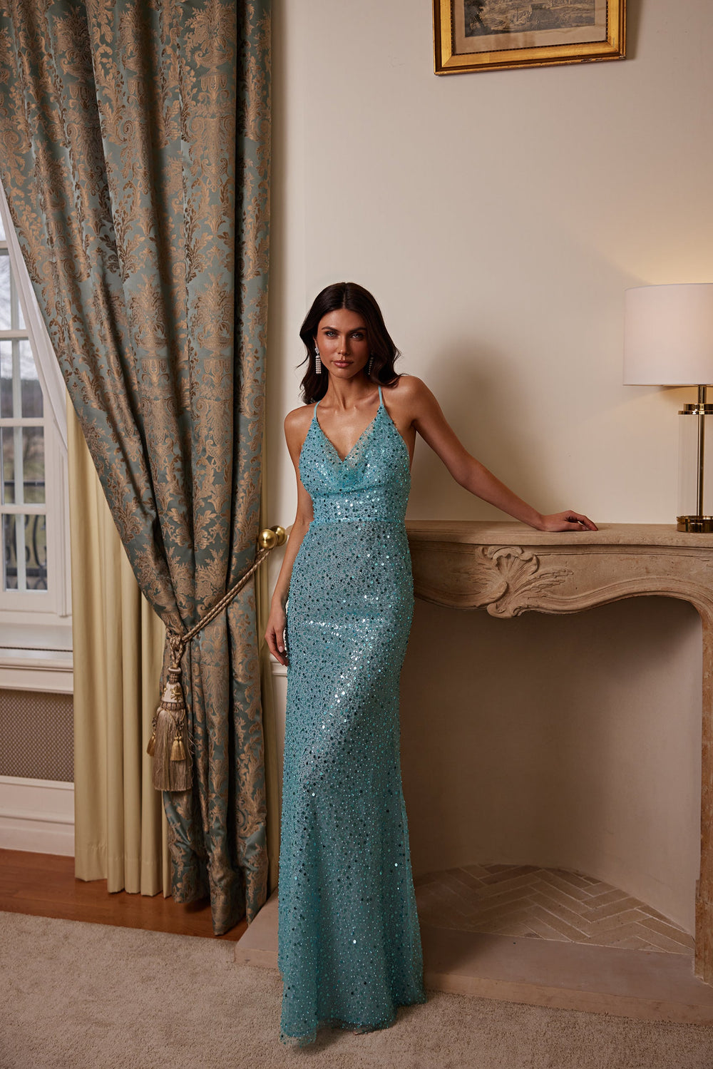 Rosalie features a flattering cowl neckline crafted in our signature beaded sequin fabric. The back is closed with adjustable straps for a custom fit, and the skirt is designed with a flared, comfortable silhouette rather than a super-fitted shape.