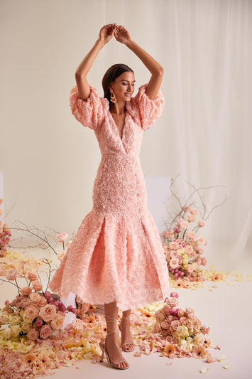 The Simona Dress offers an elegant take on evening styling. Rendered from a luxurious 3D floral fabric and elevated with an open back that is fixed with a button clasp, a full pleated skirt with a side slit, and puff sleeves. This soft coral color allows a sense of understated glamour to take control of your look.