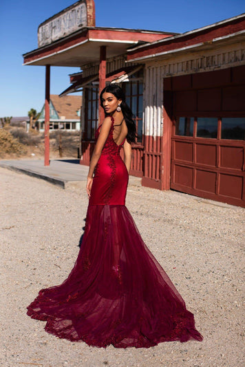 Cassie Lace Beaded Burgundy Mermaid Gown