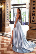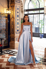Feel luxurious in our Bianca Gown. It is made from a thick satin and is double lined to the hem. It has an A line style fit with a hidden front slit. Features on this gown include a square neck and lace up open back. The material has minimal stretch.