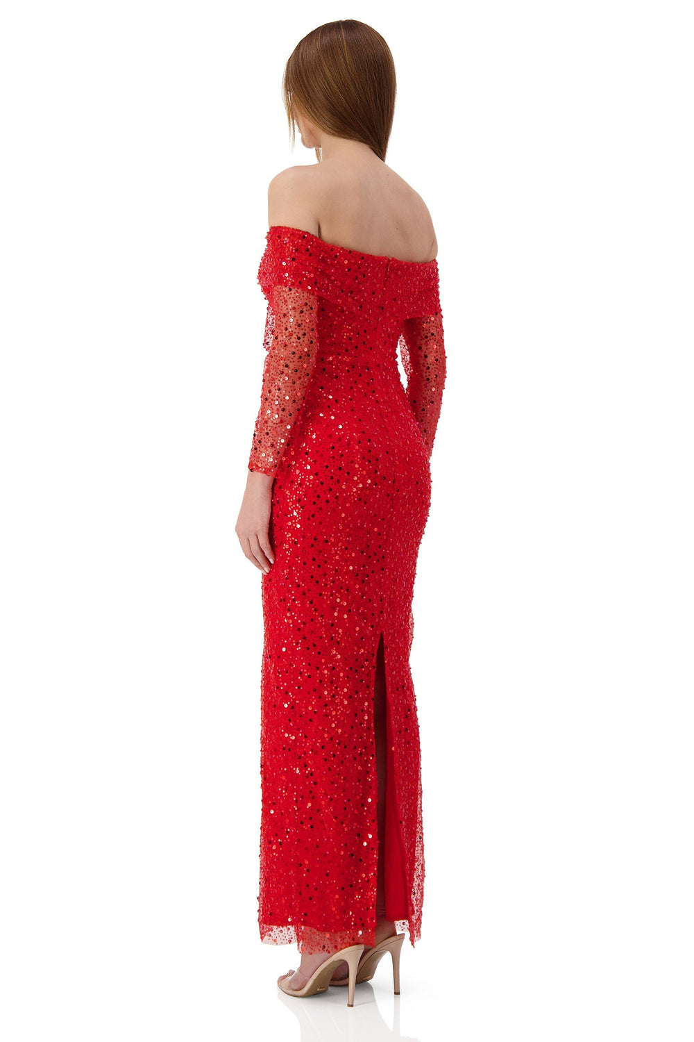 Modern and elegant, Damsel is a black-tie formal dress, best suitable for high-end events and night outs. Damsel is made from a delicate premium beaded and sequin fabric, lined with stretchy jersey fabric for a curve hugging fit. Damsel features a double folded off-shoulder neckline, sheer long sleeves and maxi length with a split at the back for easy movement. Shine at your next event in Damsel.