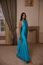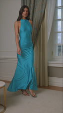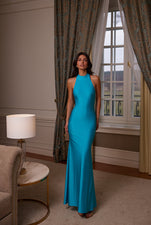 Our Elsie dress has a sleek silhouette that exudes feminine glamour. Featuring a high neck modern design, with an open back, ruching on the lower back and a fitted silhouette that flatters your figure. Elsie is an upgraded version of our Olesia dress featuring two long straps for a wow and ultra feminine look.