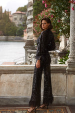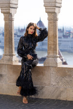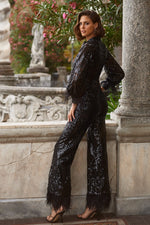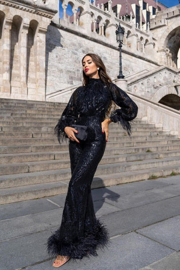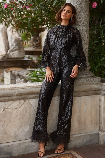 If sophisticated glamour is the look you're after, the Jessalyn Jumpsuit can provide just that. Designed with a sheer bodice, feather trims, sequinned pants, and an adjustable neck tie, this jumpsuit was created to reinvent the modern woman.