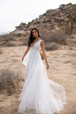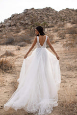 The Hazel Gown is the prettiest bridal gown ever, with stunning floral embroidery on the bust, an open back and textured pattern all over. Feel like a princess with dreamy tulle flowing behind you and a delicate lace-up back.