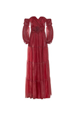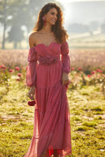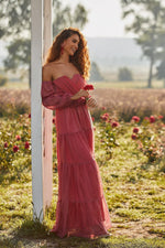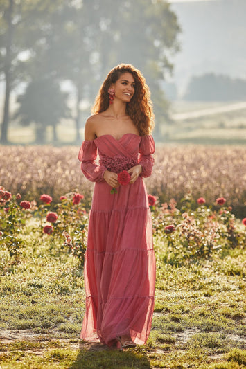Made with love, the Aleeza Dress exudes romance. Showcasing a new iridescent mesh fabric in a rosy hue and elevated with its semi-sheer off-shoulder sleeves, detachable belt, and sweetheart neckline. Encapsulate your summer glow in the Aleeza Dress.