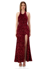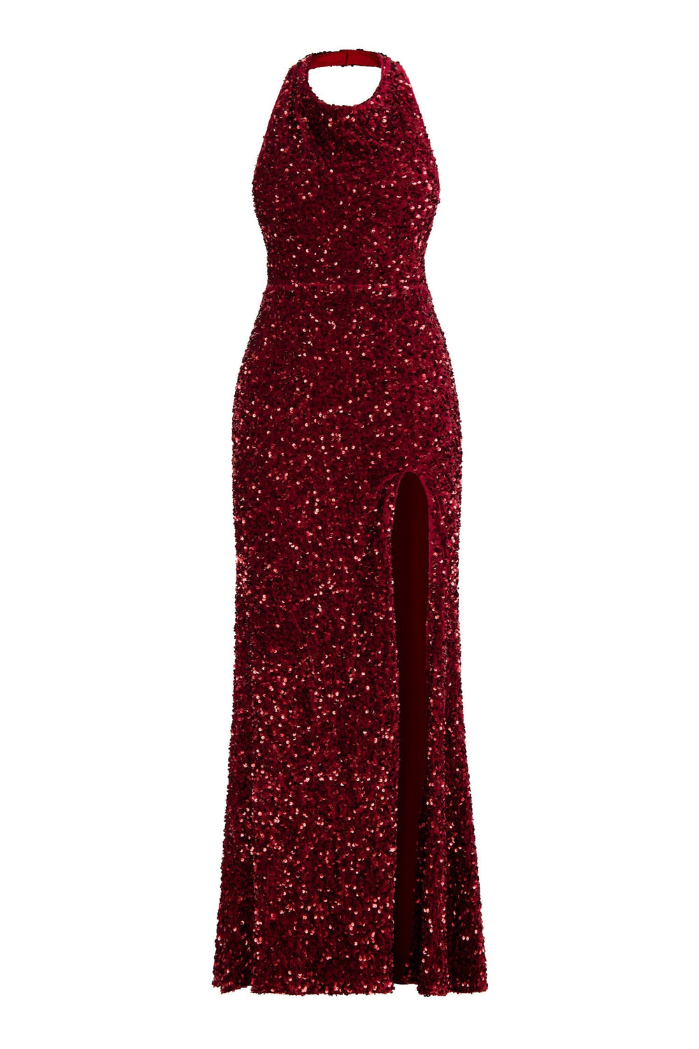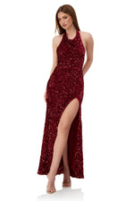 Jenny High Neckline Burgundy Sequins Maxi Gown