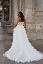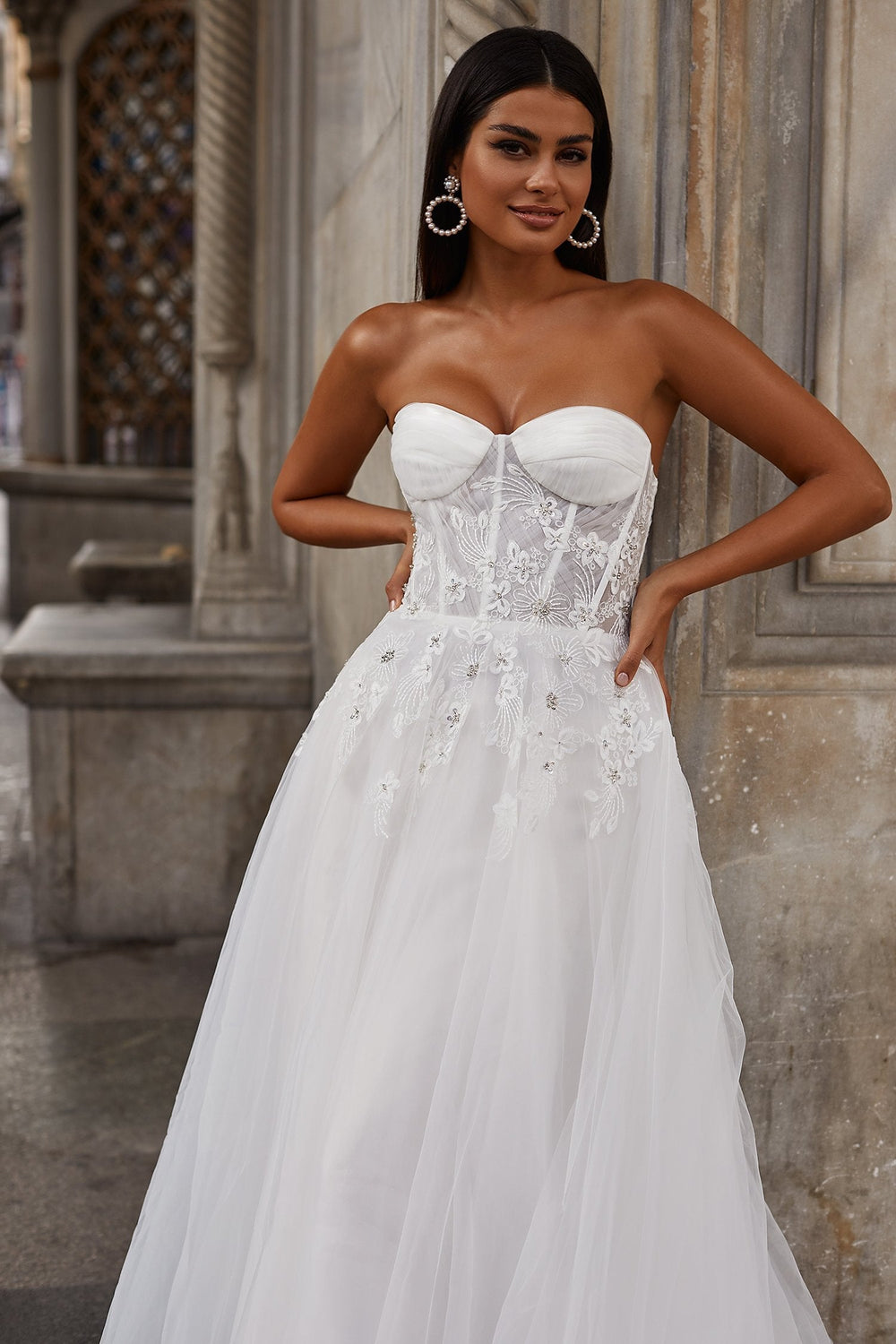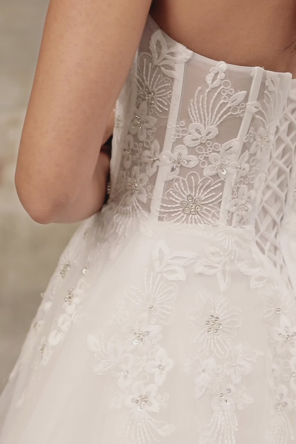 The Meliha Gown embraces romance and femininity with each refined detail. The ornate beaded tulle fabric, lace-up back, and strapless design all tie together to form the ultimate ball gown. Embroidered with lace appliques on the skirt and boned at the bodice, the Meliha Gown exudes glamour and elegance.