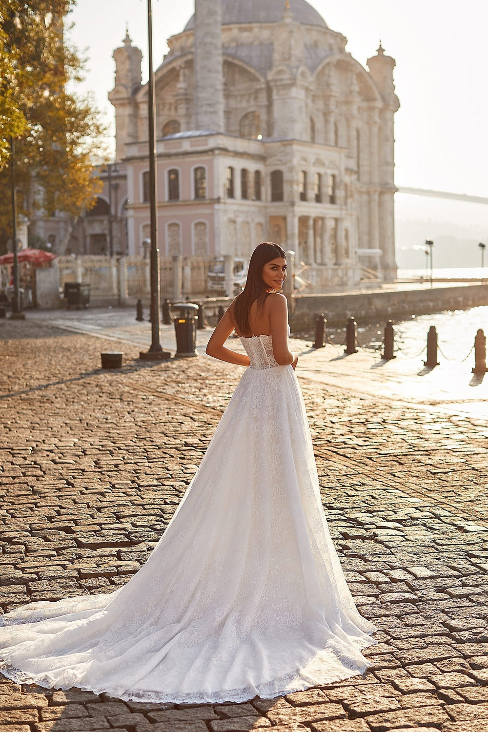 Semi-sheer bodice, white, glitter lace fabric, nude attached cups, boning in the bodice, (sleeves cut off), zip back, lace overlay, 2 x tulle fabric, 1 x white skirt underlay, train unlined, a-line fit, raw lace edge on the bust.