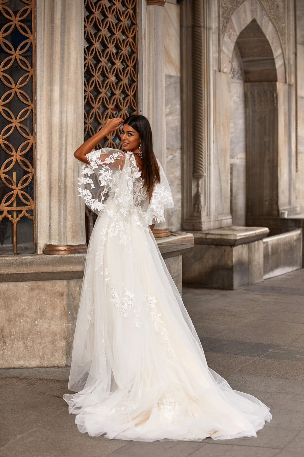 Nude mesh insert, attached bust cups, semi-sheer bodice, lace, mesh fabric with flower details & small diamante centers, zip back, cream lining and 4 x tulle layers, low v-neckline, sheer cape sleeves