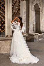 The Roxelana Gown has an abundance of feminine details to encapsulate romance and grace on your special day. Created with a sheath floral lace that is lined at the skirt, unlined at the bodice and sleeves, and executed with a nude mesh insert. This design features a low v-neckline, sheer bell sleeves, and a cream underskirt. The Roxelana Gown was made to be shown off.