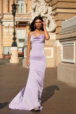 A romantic satin gown designed to turn heads. Made from a new satin fabric in a gorgeous lilac colour & features a cowl neckline, thin adjustable straps which criss-cross at the back & fitted silhouette with a train.