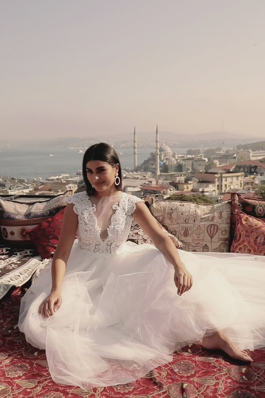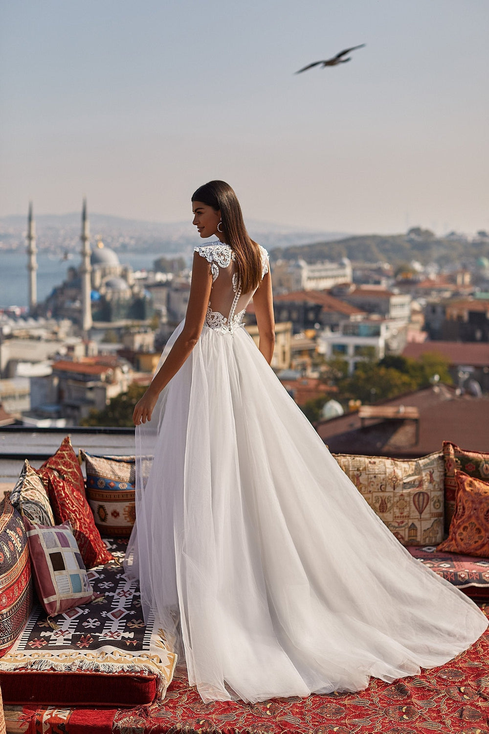 A timeless classic with updated design elements, the Sefa Gown has the perfect combination of both traditional and modern features. Made with sweet cap sleeves, a low-v neckline, and a sheer nude back with button details. The A-line silhouette and tulle skirt bring the look together for the sweetest bridal look.