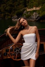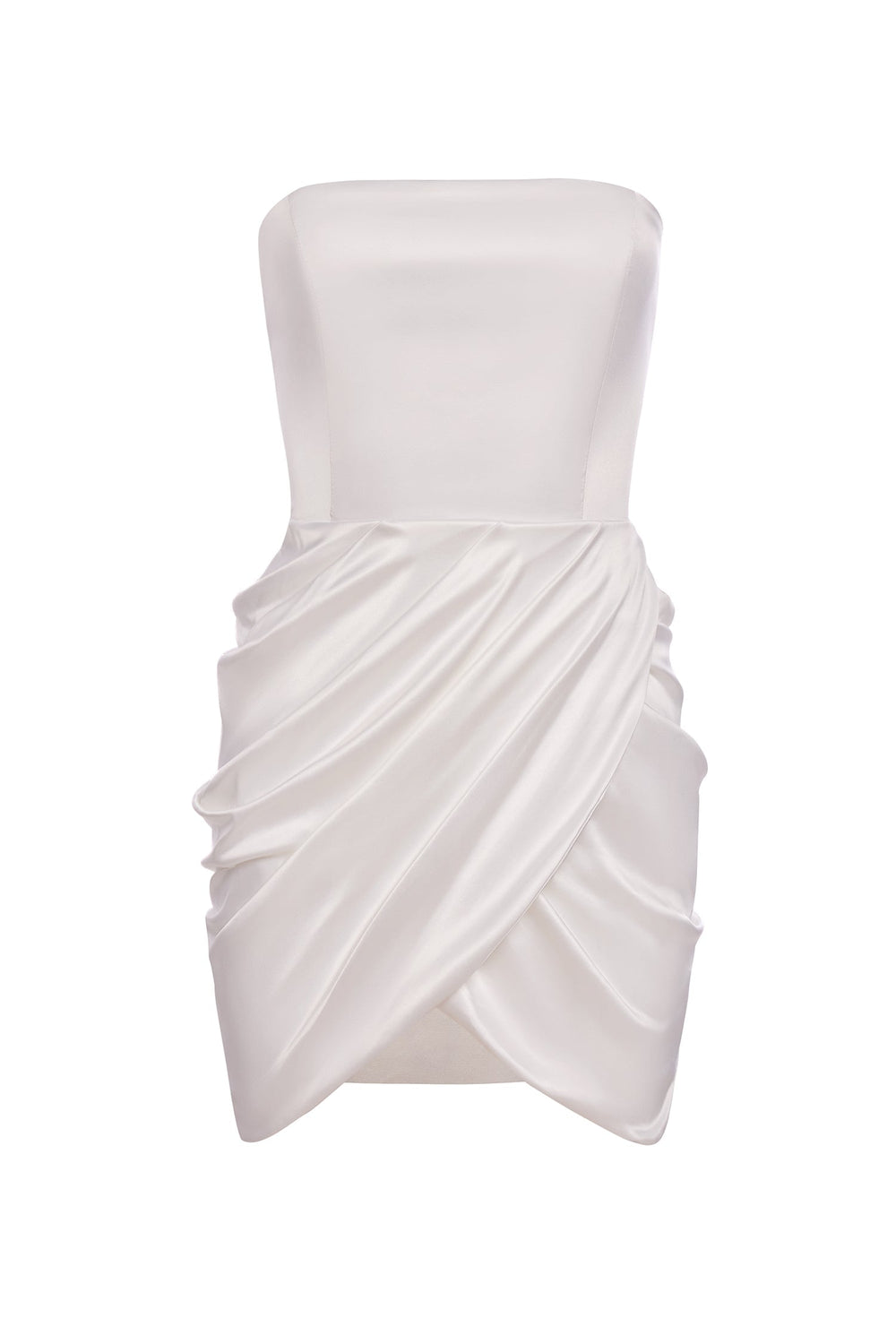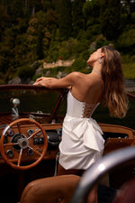 Defined by its draped skirt and large bow back, the Cecilia Dress embraces its romantic appeal. Strapless at the neckline and laced up with a dainty string, this style is perfect for those future brides-to-be.