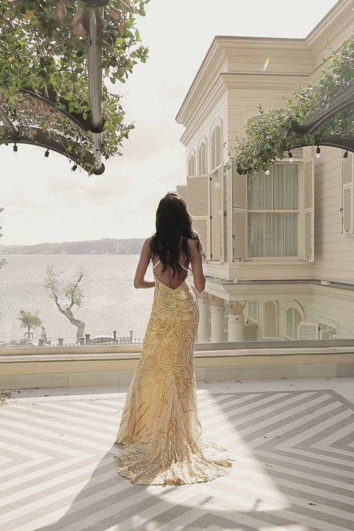 Glamorous & show-stopping, the Alayna Gown is made from our signature luxe sequin patterned fabric in gold. This gown features a cowl neckline, fitted mermaid silhouette with a train & adjustable criss-cross back straps.