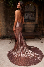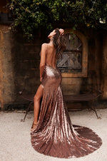 Armanah gown is embellished with sequins, this gown reflects serious glow in the sunlight. Featuring a deep neckline with a low open back. An elegant side slit and a massive train to turn heads.