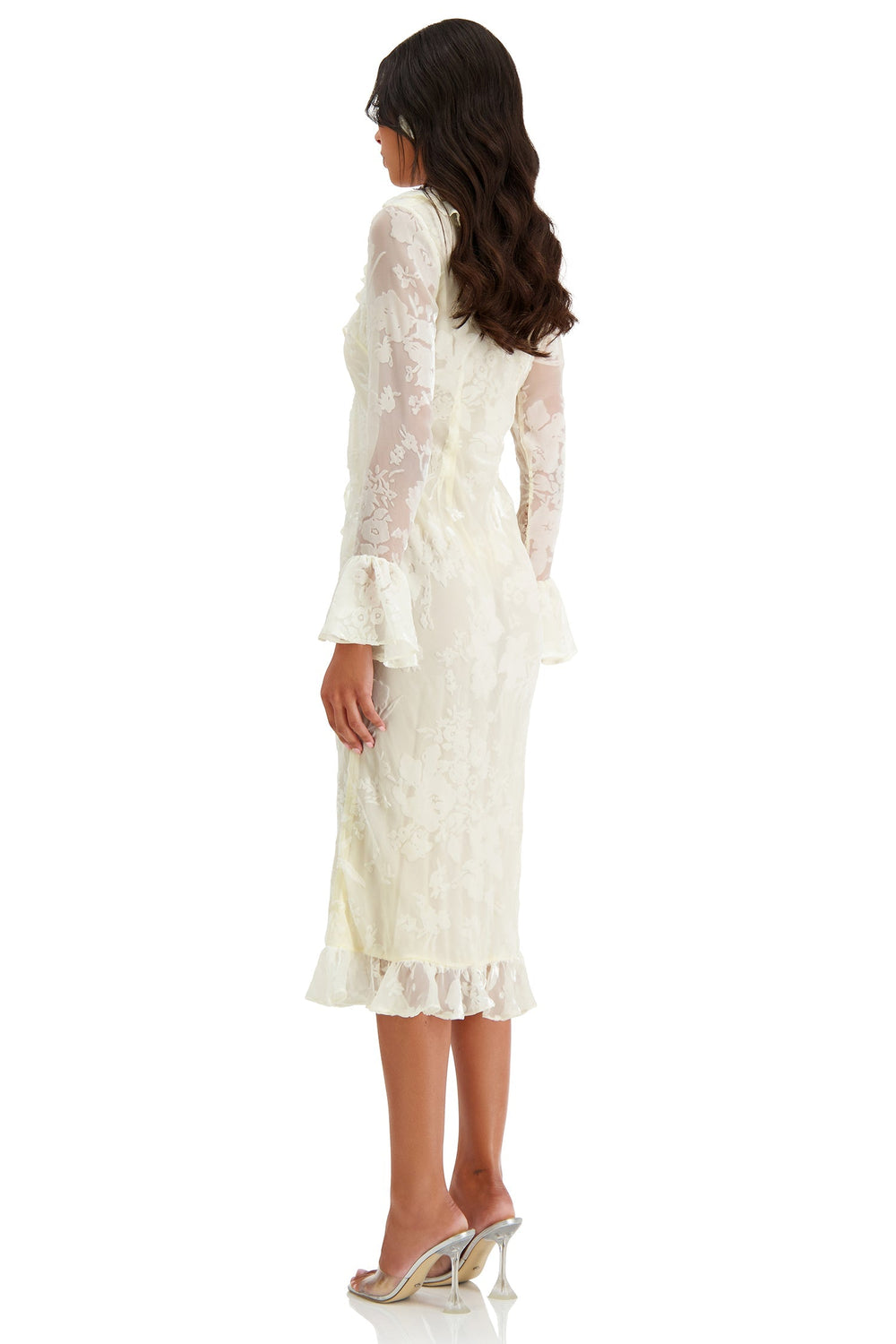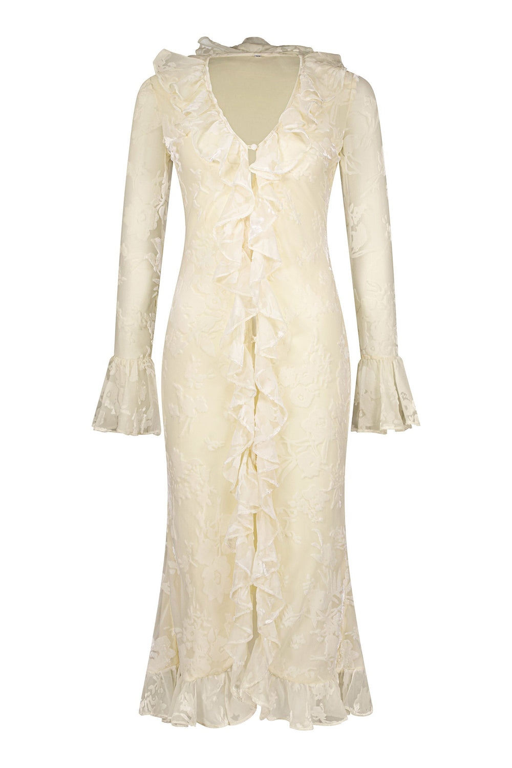 Meet the Barbarella Dress – a dreamy sheer long-sleeve dress adorned with ruffle details, crafted from premium floral devoré fabric, with 3D flower details strategically placed along the dress. The devoré technique, creates an intricate pattern of semi-transparent florals. Barbarella is a timeless and elegant piece, featuring ruffled trim along the closure, sheer long sleeves, and a flowy skirt, making it ideal for after-beach drinks, beach clubs, or wearing over a bikini.