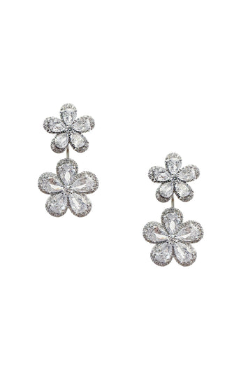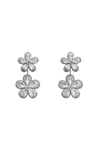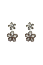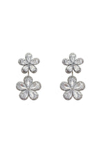The Blina Silver Flower Earrings are bound to draw attention with any look. Rendered from silver hardware and encrusted with a diamante trim. This design features a double delicate flower design for a feminine aesthetic.