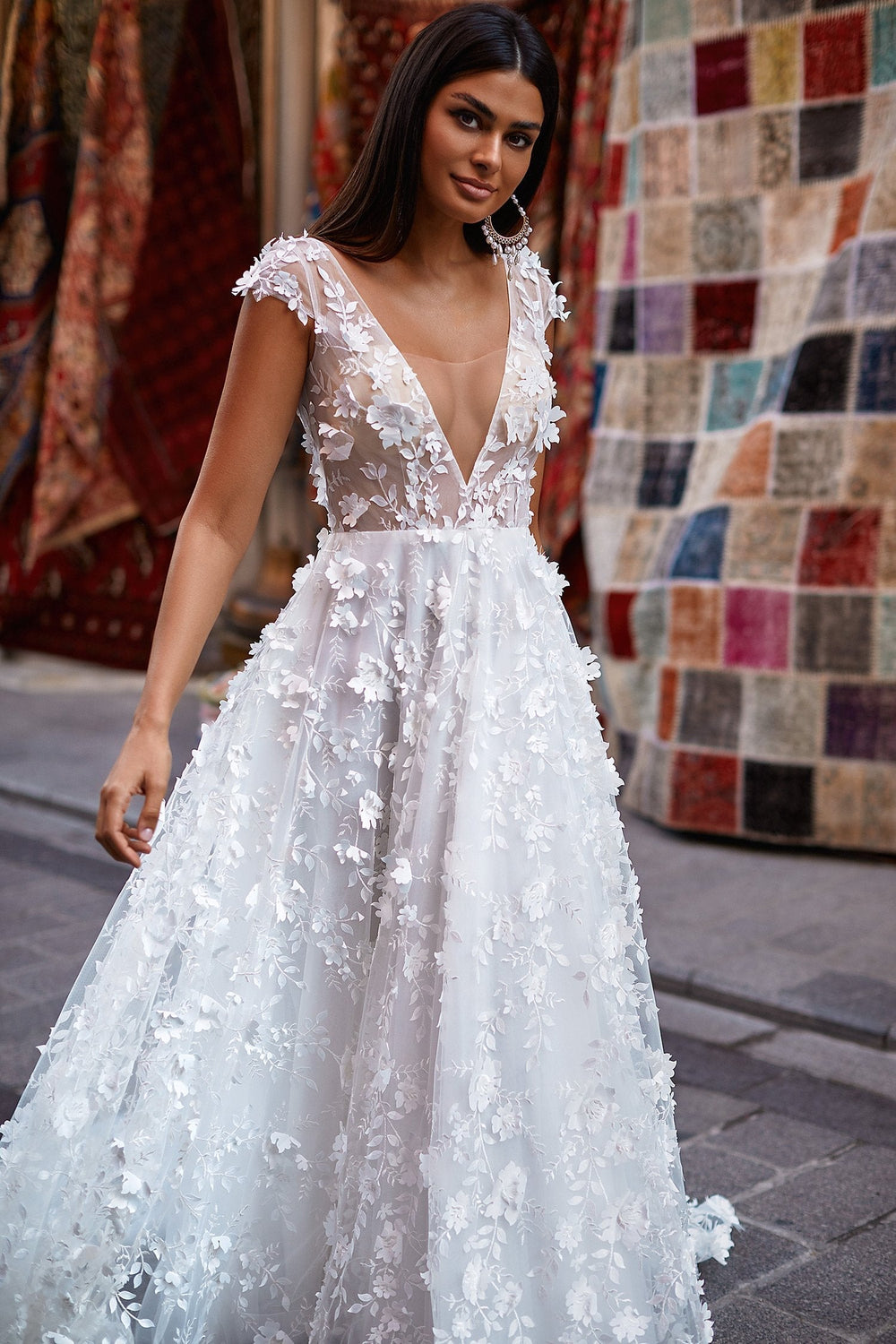 The Derya Gown brings a fashion-forward statement to your bridal look. Created with a sheer bodice, deep v-neckline, cap sleeves, and adorned with delicate 3D floral details, you'll be sure to make a statement.