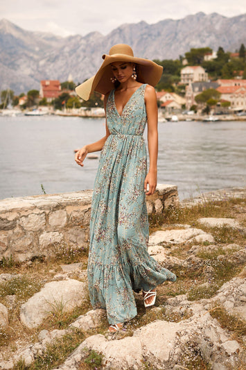 The Duaa Dress provides simplicity for your spring/summer vacations. Effortless in design with its v-neckline, a-line silhouette, and teal colour. The Duaa Dress is elevated with its floral printed fabric and gold-toned embroideries.