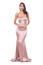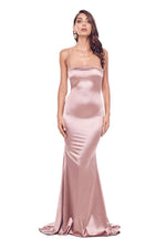 Incredibly flattering cut and made to create a booty-curve, this body-con is the gown that does everything for your figure. This gown has a demure mermaid silhouette and full length hem. Made from luxurious thick satin. It features adjustable straps and an exposed back zipper.