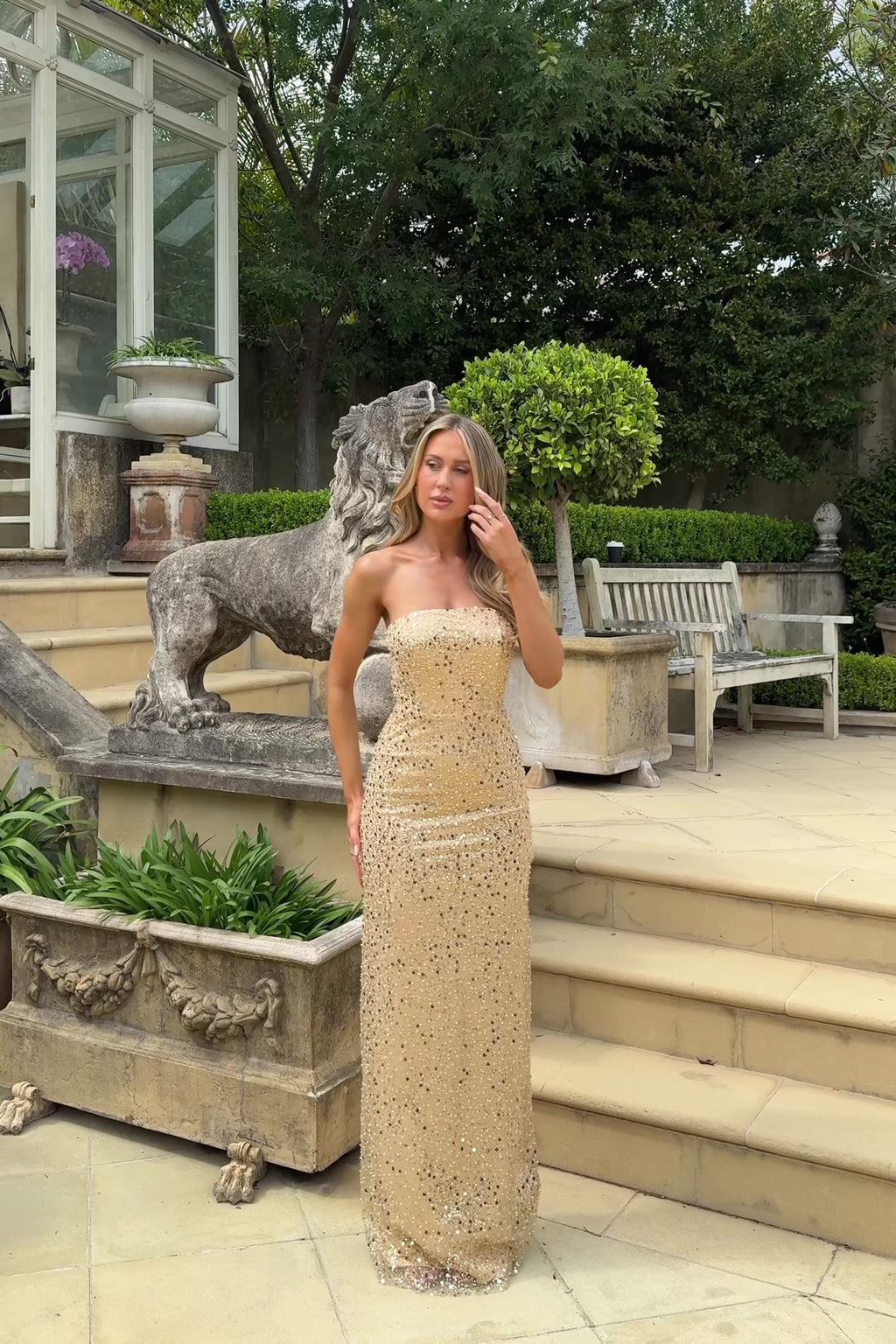Meet the Nalani Dress, a sophisticated and elegant strapless design made from a premium gold beaded fabric. Nalani features a strapless neckline, fitted silhouette and a slit in the middle at the back. Nalani has minimal stretch, and is fully lined.
