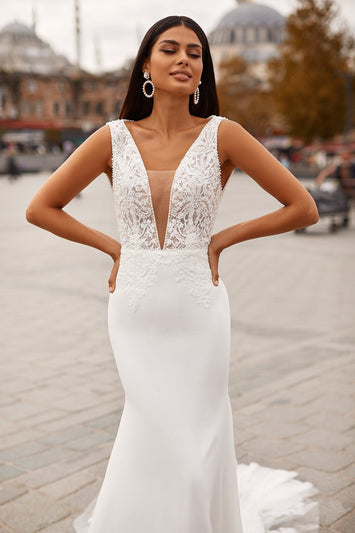 Modern and stylish, the Nazan Gown is the perfect contemporary look for your wedding day. Made with a semi-sheer lace applique bodice with pearl details and a nude mesh insert. Refined to perfection, this gown also features an open back with button details and a lace chiffon overlay. The Nazan Gown was made with all the finer details.