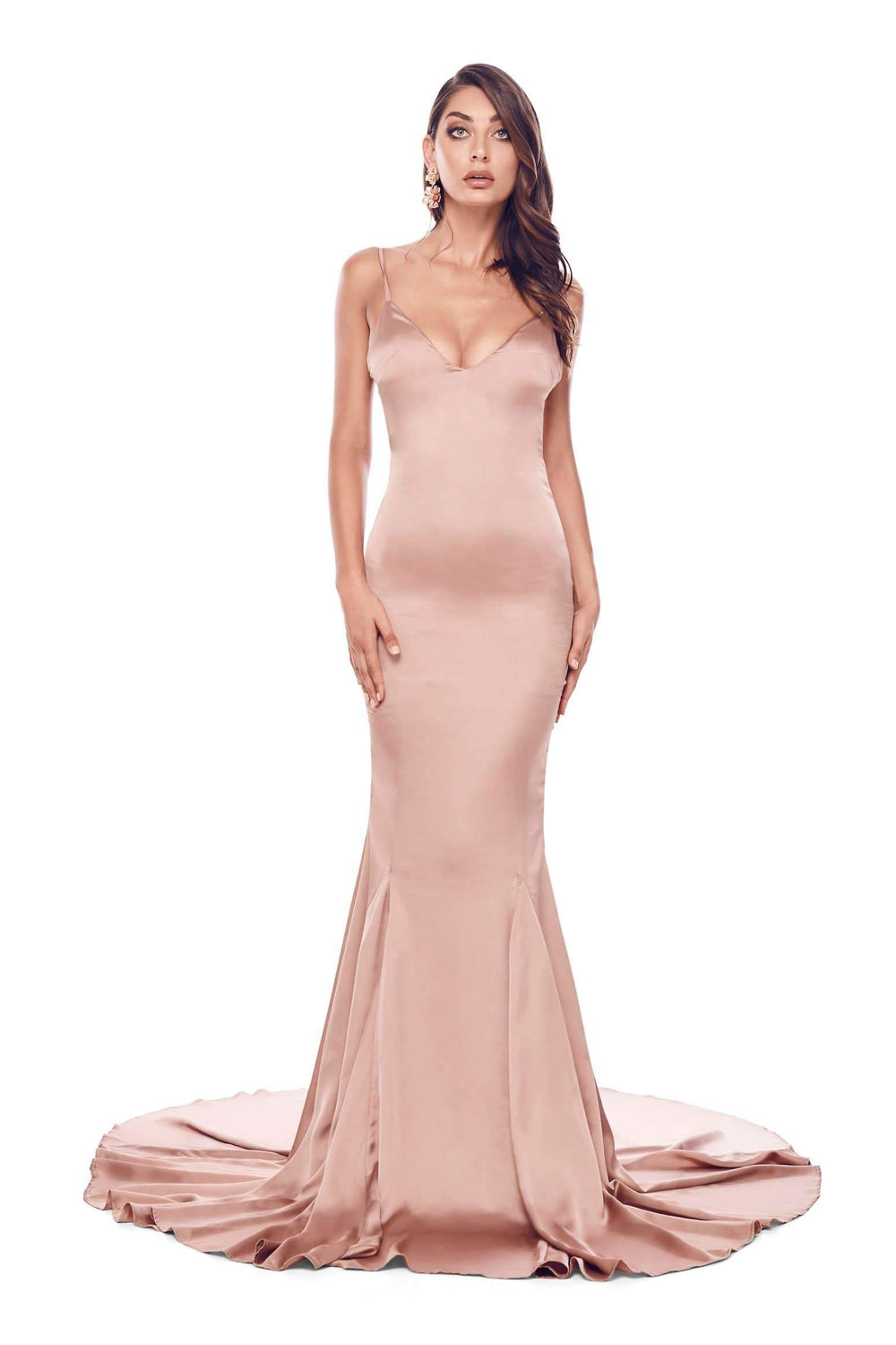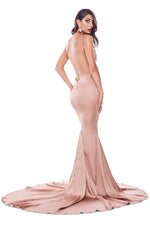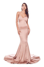 Become a beautiful goddess in the Tamara gown. This gorgeous satin gown features a plunge v-neckline, adjustable straps, open back, mermaid silhouette and a long sweep train. The Tamara gown will exceed your expectations.