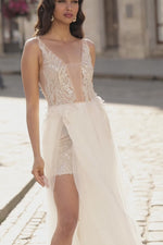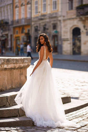 Introducing the Cecile Gown, a masterpiece of opulence and refinement. This stylish and shimmering creation is adorned with sparkling silver appliqué and sequins that dance gracefully upon a canvas of dreamy tulle. Its daring plunge neckline, tantalizing side slit, and captivating exposed back combine to create an alluring statement of high-end couture.