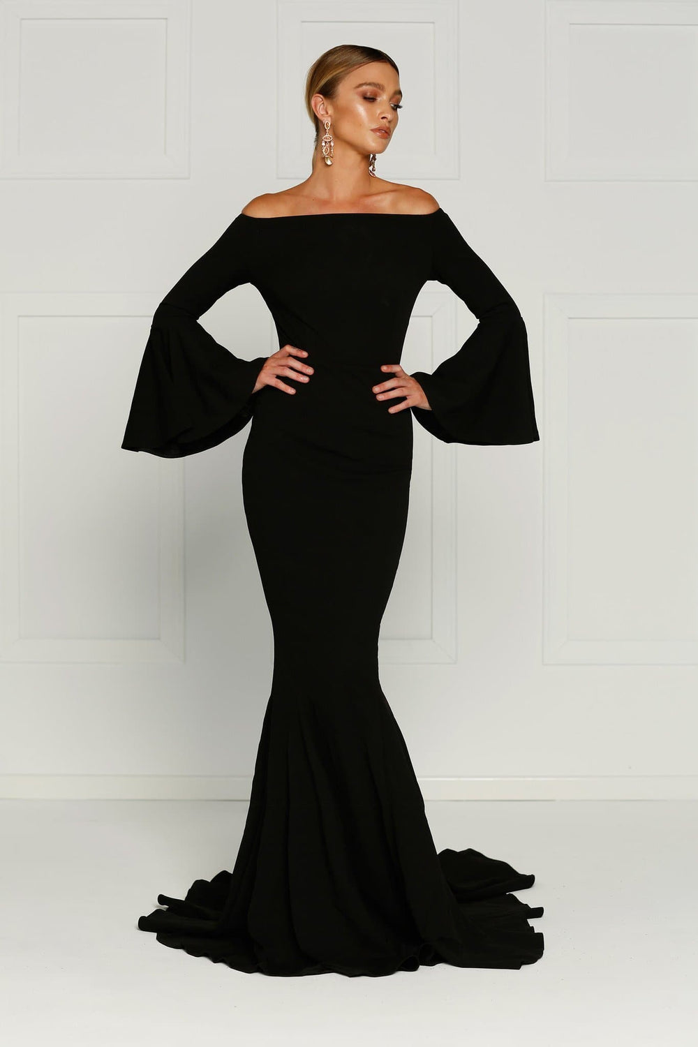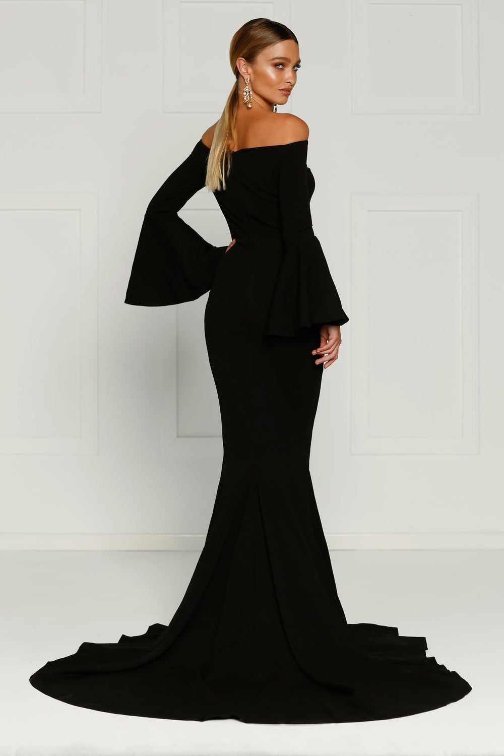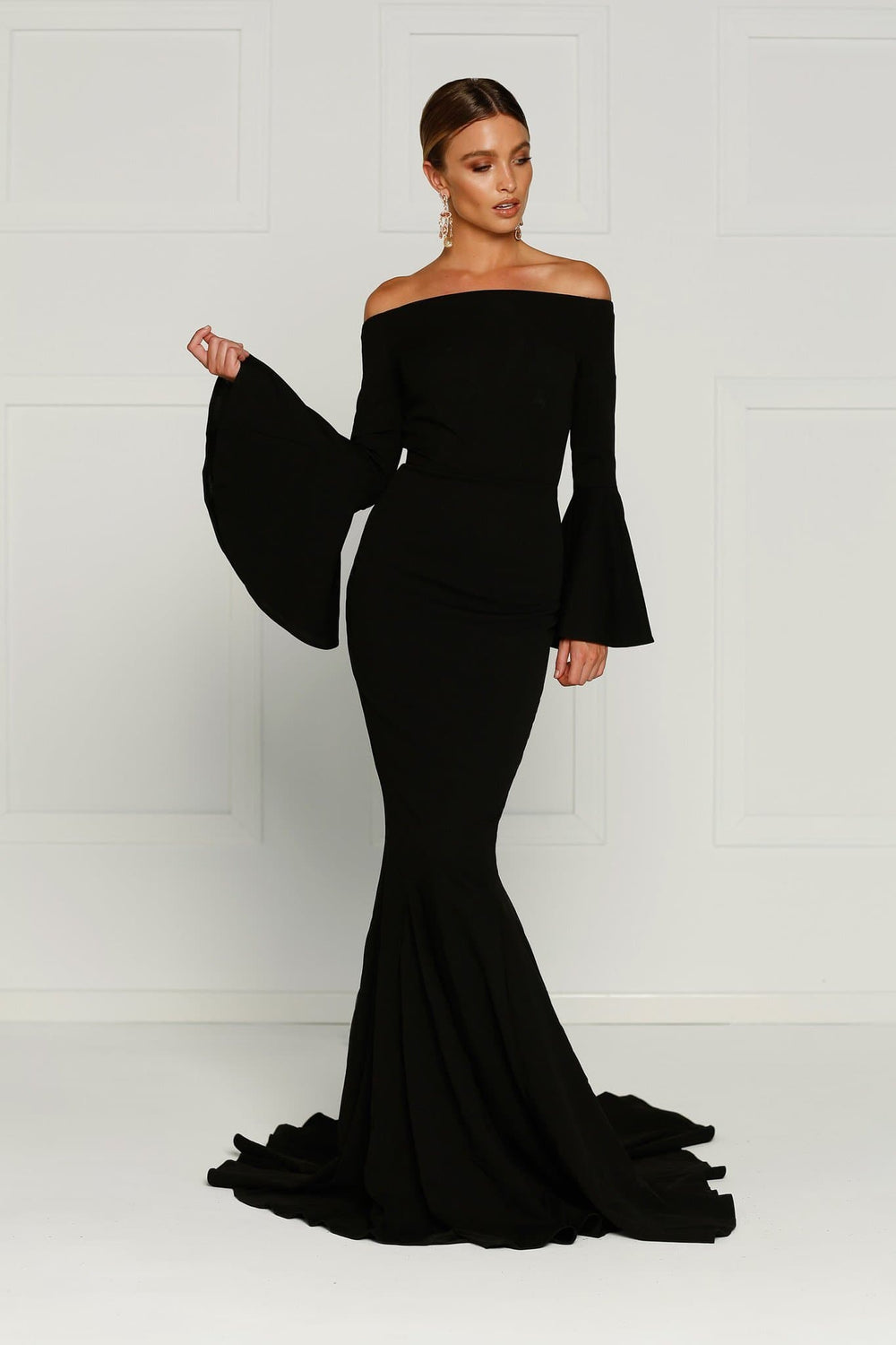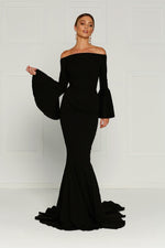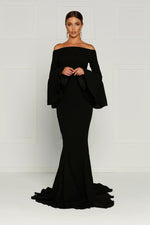 Romantic, sophisticated and fun. Fabricated from thick crepe stretch fabric and double lined for the best curve hugging fit. This gown features a beautiful off-the-shoulder neckline and big flare bell sleeves.