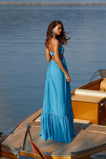 Bright colours are trending this season and the Arella Dress honours that. Showcasing a vivid blue tone and designed with a halter neckline, side cut-outs, and flowing a-line silhouette. The Arella Dress is so effortless.