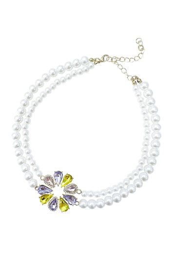 The Bella Pearl Necklace adds personality to your favourite ensemble. Featuring a double pearl chain and a multicoloured flower design containing gems in an array of pink, green and purple hues.