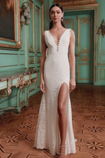 Sultry and alluring, this lace gown brings a romantic approach to your evening wear. Designed with a low v neckline, open sides, and detailed scalloped sleeve edges. The Harmonia Gown fits at the waist and grazes the floor with a short train.