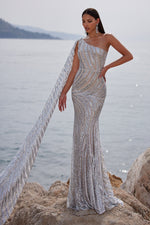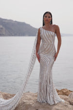 The Laurine Gown is the perfect gown for maximalists. With a statement-draped shoulder piece and shimmering sequin fabric, this style will be sure to catch all the attention. Featuring a fitted mermaid silhouette and a one-shoulder asymmetrical neckline.